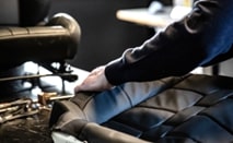 ナッパレザーに施されたパールトップステッチは、糸が玉粒状に表面に露出するように施され、光を受けると真珠のように輝き、インテリアに華やかさと気品を添える。