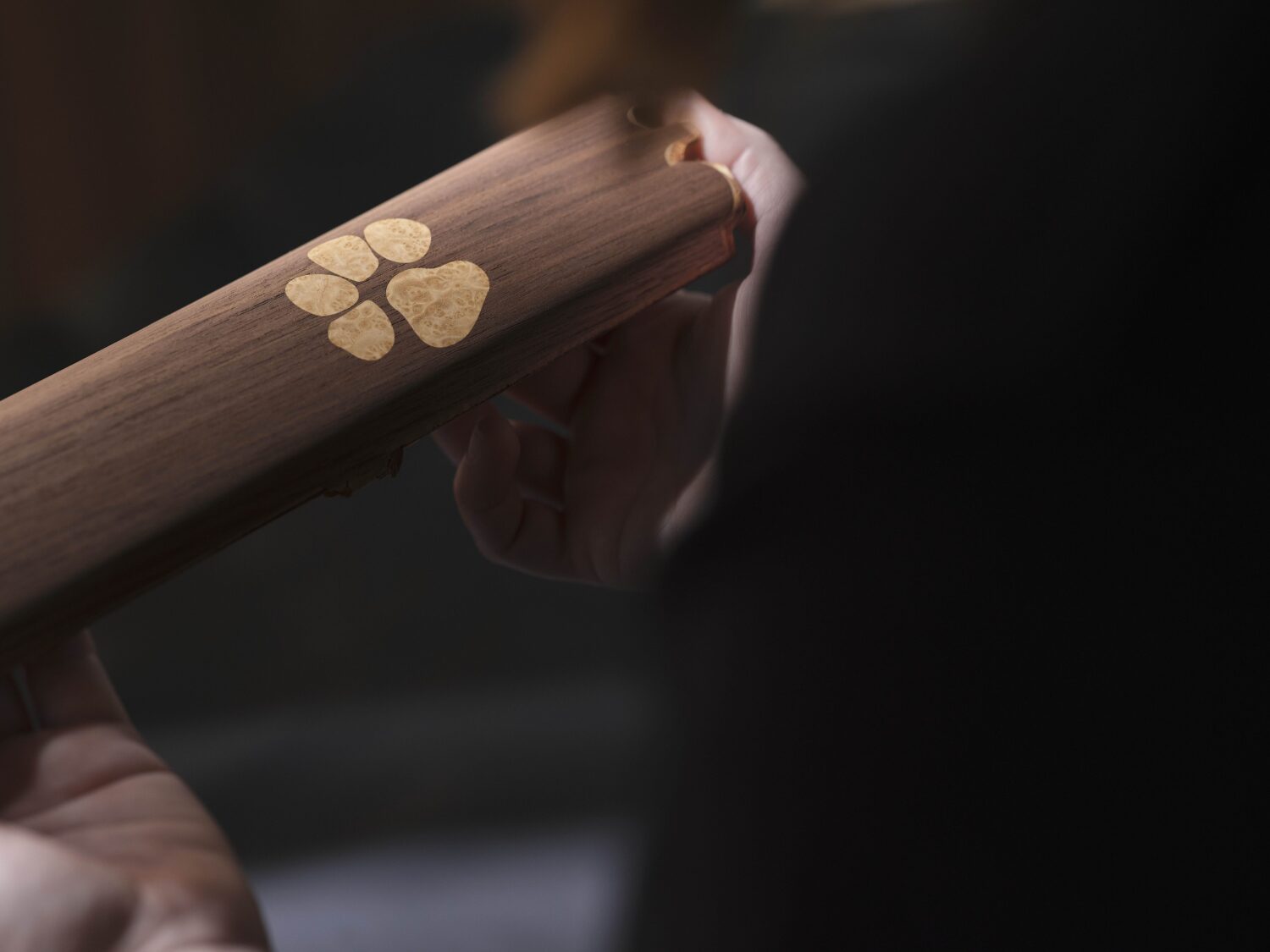 ダッシュボードの助手席側には、ベイリーへ捧げるもう一つの小さな寄木細工のモチーフがあり、彼の肉球の跡を正確に再現したデザインが施されている。
