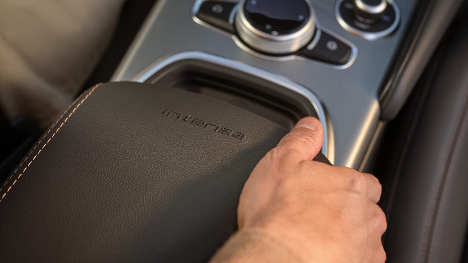 センターアームレスト タンカラーステッチ、INTENSAロゴ
