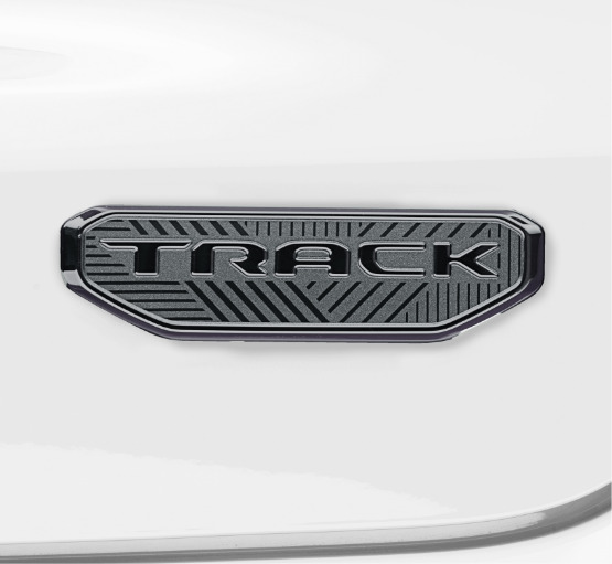 エクステリアには、ボディ同色のフロントフェイシアとホイールフレア、シルモールディングに加え、グレーのアクセントを施し、スタイリッシュな印象に仕上げ、ジープロゴバッジを従来のクロームからグロスブラックへ変更したうえで専用の“TRACK”バッジを装着することで、限定車ならではの存在感を際立たせている。