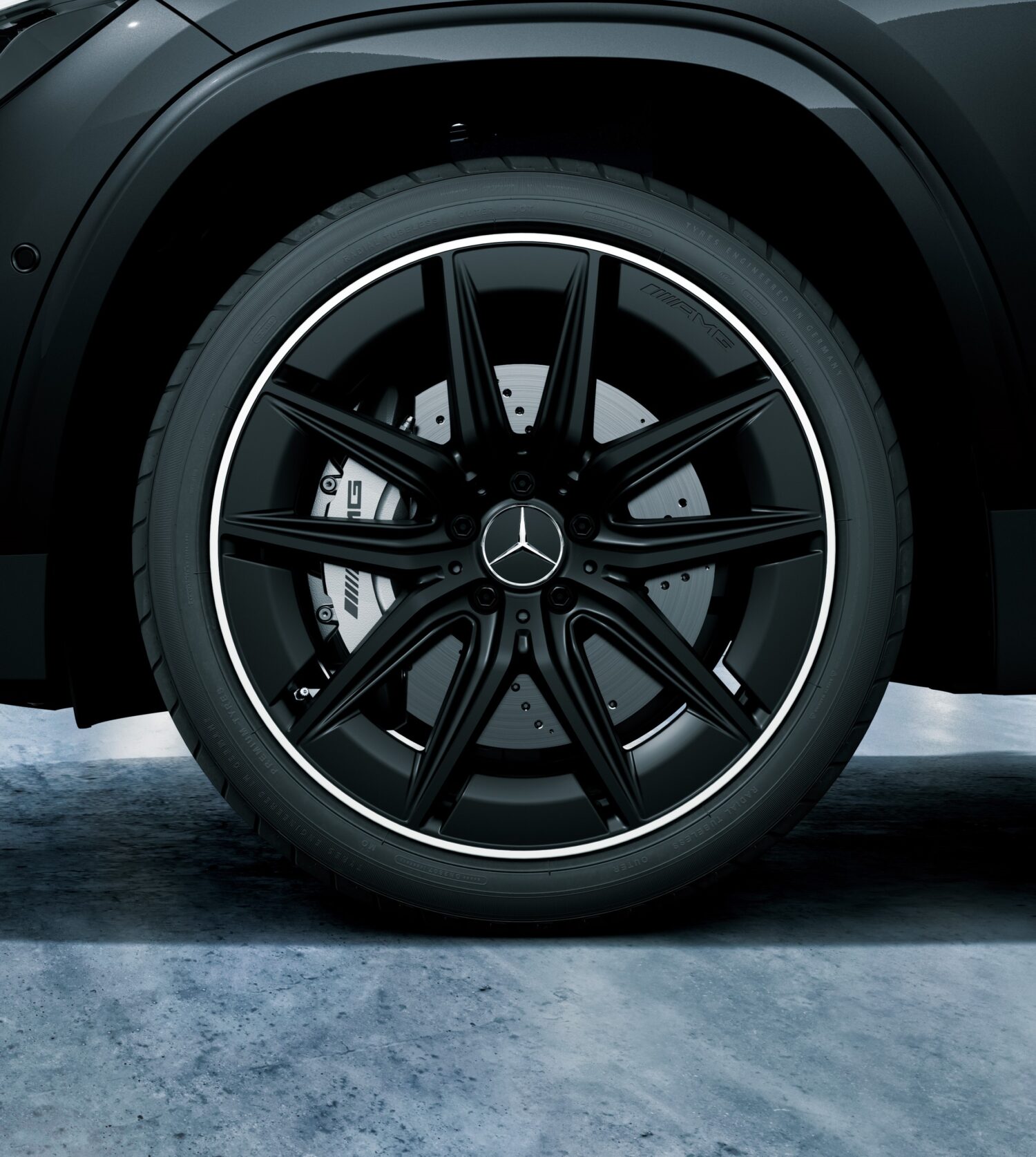 エクステリアは、外装色コスモスブラック(メタリック)に、通常モデルには設定の ない「AMGナイトパッケージ」および「AMGエクステリアナイトパッケージII」を採用し、 フロントグリル、サイド/リアバッジ、フロントスプリッター、ルーフレール、エグゾーストテールパイプトリムなど、細部までハイグロスブラックまたはブラッククロームのアクセントを施し、ホイールにはブラックの「20インチAMGアルミホイール」を採用し、 洗練された印象のデザインになった。