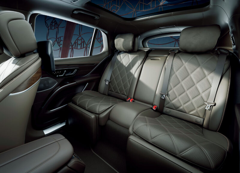 センターコンソールには格納式テーブルと、温度調整機能が備わったカップホルダーを配置。標準装備として装着されているシートベンチレーターに加え、ファーストクラスパッケージを追加すると、センターアームレストヒーターも装着され、より後席で快適な時間を過ごすことが可能となる。